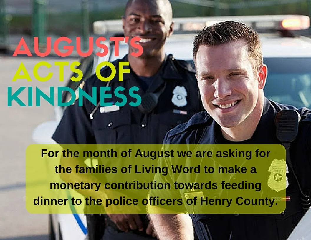 For the month of August we are asking for the families of Living Word to make a monetary contribution towards feeding dinning to the police officers of Henry County. Please place your donation in an offering envelope and mark it “AOK” by Sunday, August 28 th . For more information, please see Miss Kerry or call the church office.