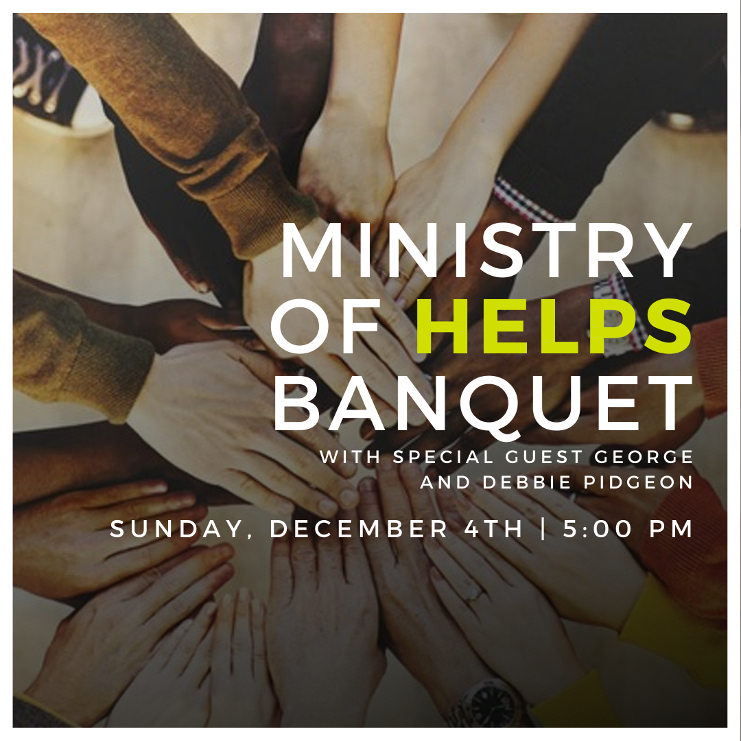 Ministry of Helps Banquet in the Fusion building at 5:00 PM. This is for all those involved in the Ministry of Helps. Dinner will be provided and Special guest George and Debbie Pidgeon will be speaking. There will also be drawings for prizes! Please provide your own child care. Register online at livingwordchurch.faith by December 1st.